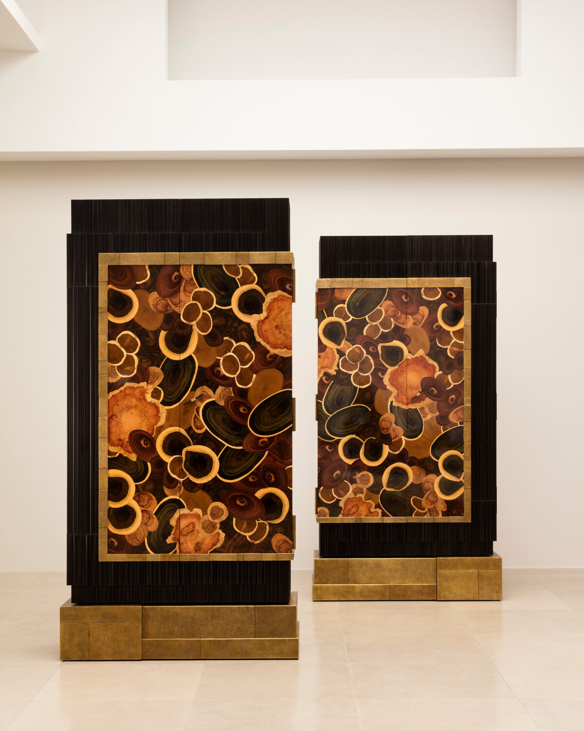 Monumentality, style and savoir-faire characterise this exceptional piece of furniture, whose seeming starkness is softened by the intense vibration of precious woods marquetry, the texture of sculpted ebony and precision of golden patinated bronze elements. The Indian rosewood interior reveals a secret cabinet.