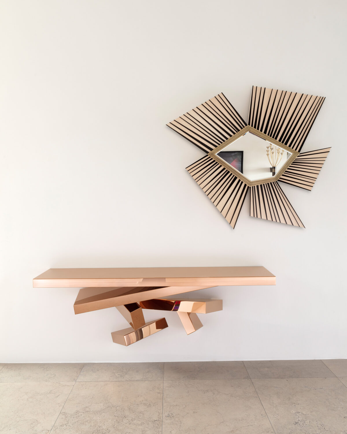 Sorti d’un tableau cubiste, cet œil stylisé rayonnant est composé d’ébène du Gabon, de sycomore, de bronze à patine bicolore et d’un miroir biseauté. Il s’agit d’une pièce unique.