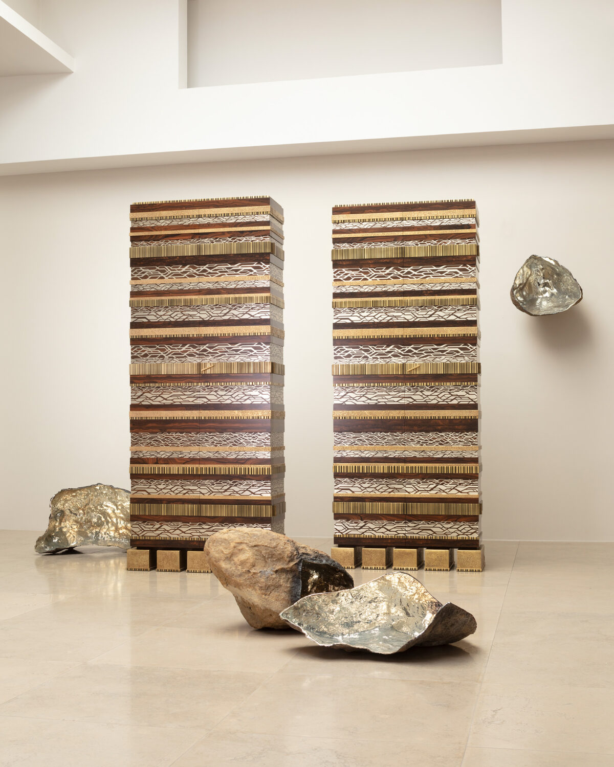 Cette paire unique est un exemple de réinterprétation moderne de la marqueterie Boulle. Métal et bois sont méticuleusement marquetés dans un réseau arachnéen de maillechort et de ziricote. De puissants bronzes viennent ceinturer et renforcer la présence de ce meuble à l’intérieur en padouk.