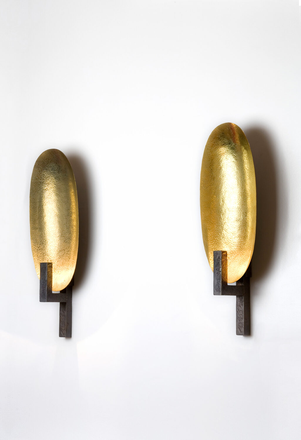 Reposant sur un bras en bronze texturé à patine chocolat, une coque de laiton martelé et mordoré reflète et diffuse délicatement la lumière. Cette applique existe également en finition nickelée.