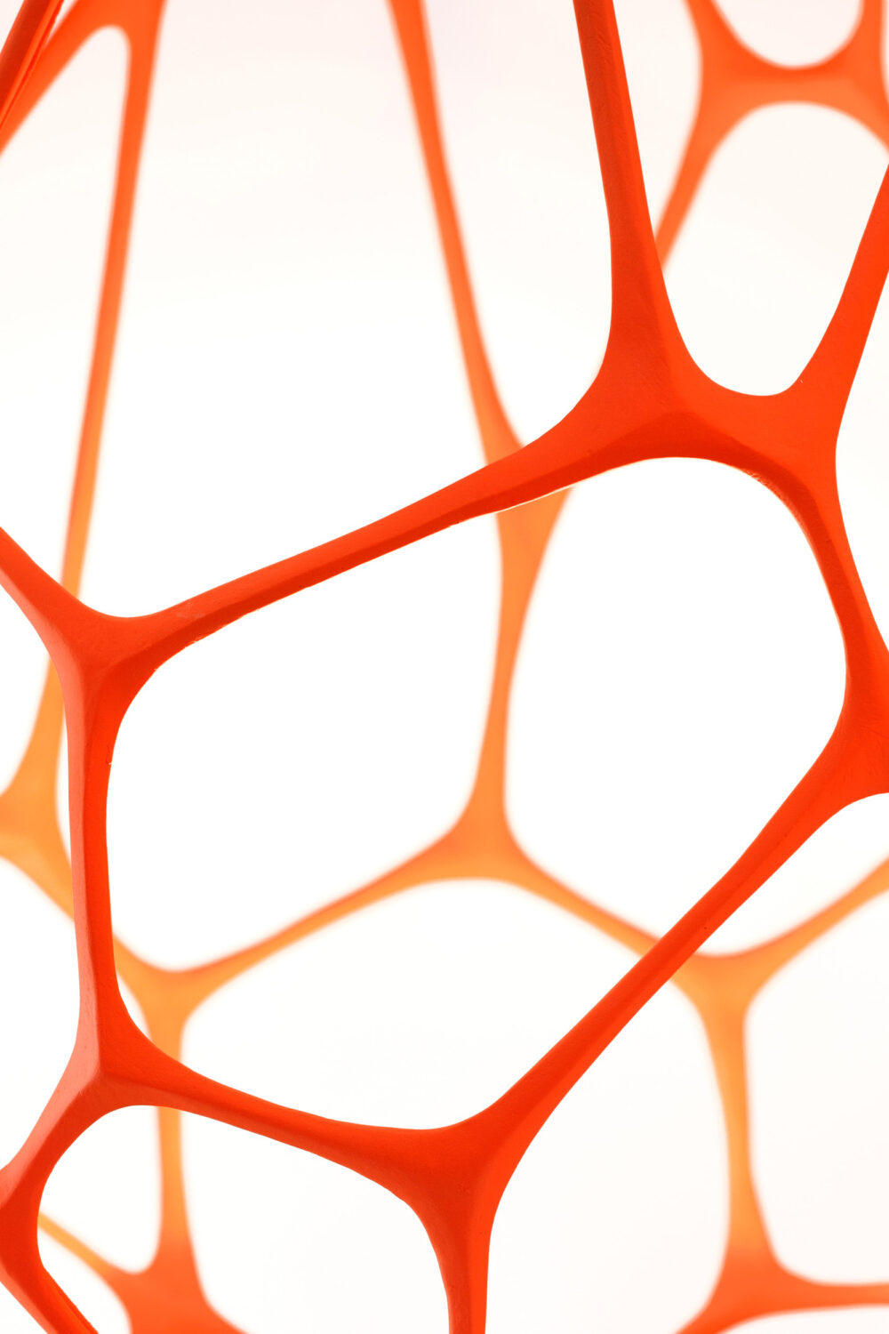 Graphique et organique, ce lustre en bronze laqué étonne par ses proportions généreuses, sa légèreté visuelle et sa luminosité capturée dans sa résille étirée et sculpturale. Il existe en petit et grand modèle.