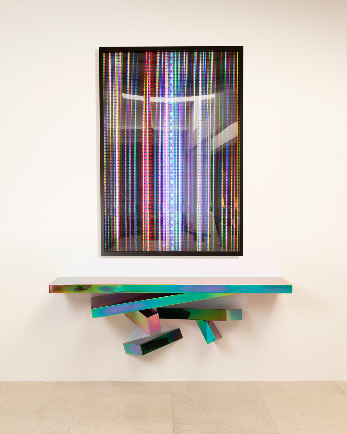 Comme en lévitation, des blocs d’inox jaillissent du mur dans un mouvement dynamique pour former cette console insolite aux multiples coloris. Elle existe également en finition or rose.
