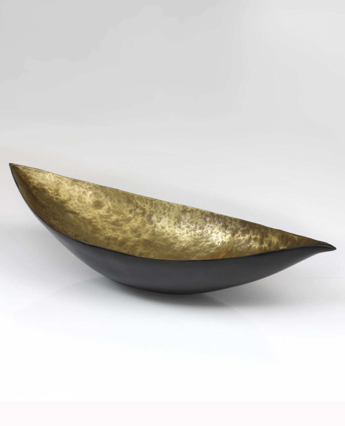 Cette coque de bronze délicate affiche une patine bicolore, noire à l’extérieur et mordorée à l’intérieur.