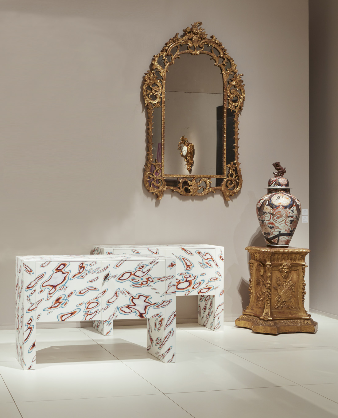 Un élégant buffet en bois arbore une laque façon «Fever», emblématique des recherches du designer sur la matière. Il s’agit d’une superposition de plusieurs couches de laques sauvagement poncées pour en faire surgir des effets multicolores et hypnotiques.