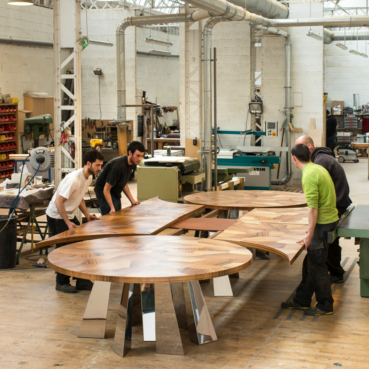 Provoquer de fructueuses rencontres entre un matériau précieux et un autre plus ordinaire, tel est le crédo de cette table monumentale et ajustable, dont le plateau en marqueterie de dibetou repose sur un piétement en acier inoxydable.