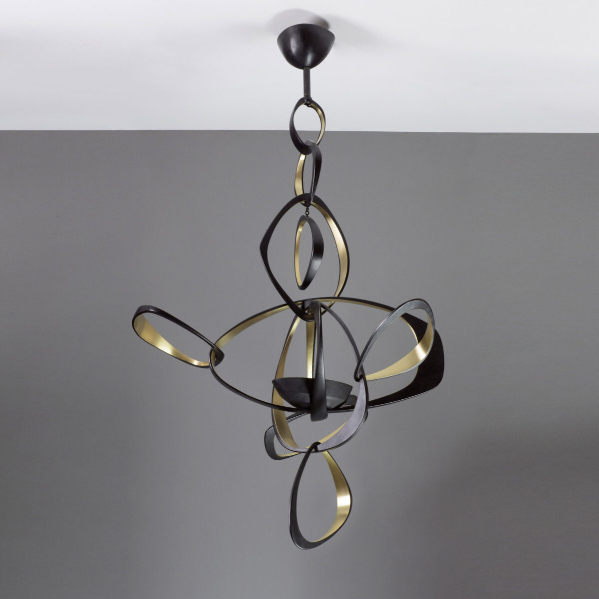 Pièce emblématique du designer, le lustre Volubile allie mouvement, asymétrie et enchevêtrement, tandis que le bronze à patine bicolore crée un jeu d’interactions entre opacité et brillance. Il s’agit ici du grand modèle.