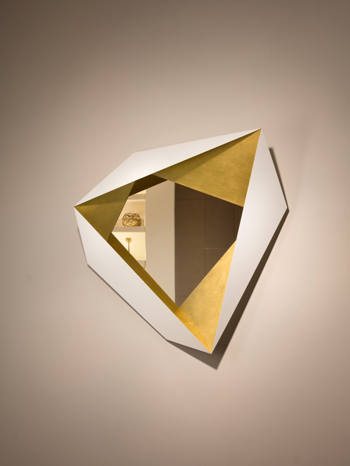 Effet de tridimensionnalité surprenant pour ce miroir au style épuré, fait de bois laqué noir ou blanc et de feuille d’or. Minimaliste dans son concept de ruban plié, ce miroir est une géométrie complexe et harmonieuse. Il existe en petit et grand modèle.