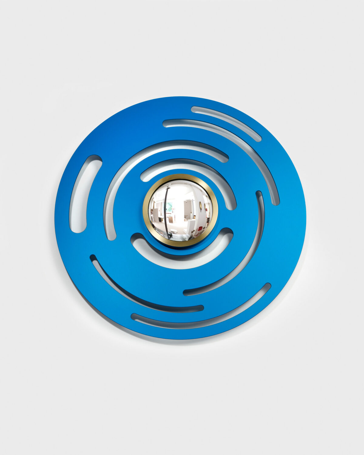 Parti pris mécanique pour une pièce qui semble en rotation. Le miroir Solaire utilise la juxtaposition du traitement industriel de l’aluminium anodisé bleu ou gris et du bronze patiné dans un saisissant contraste qui en révèle son rayonnement. Il existe également en laiton patiné.