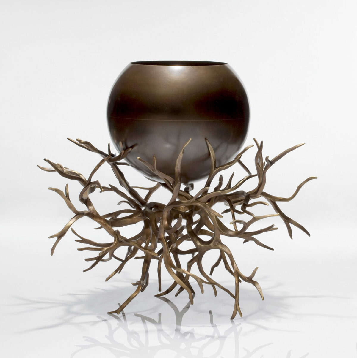 Evocation d’une nature sauvage et buissonnante, des branches en bronze à patine dégradée, entre vison et mordoré, portent une coupe de laiton.