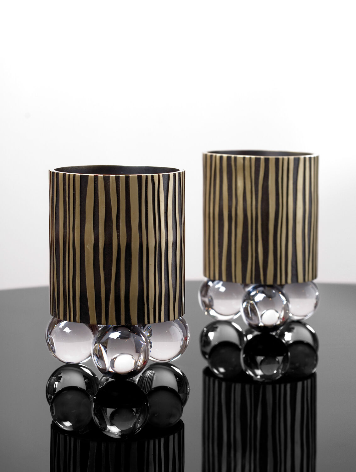Des sphères de cristal de Bohème supportent une coupe cylindrique de bronze à patine bicolore noire et mordorée.