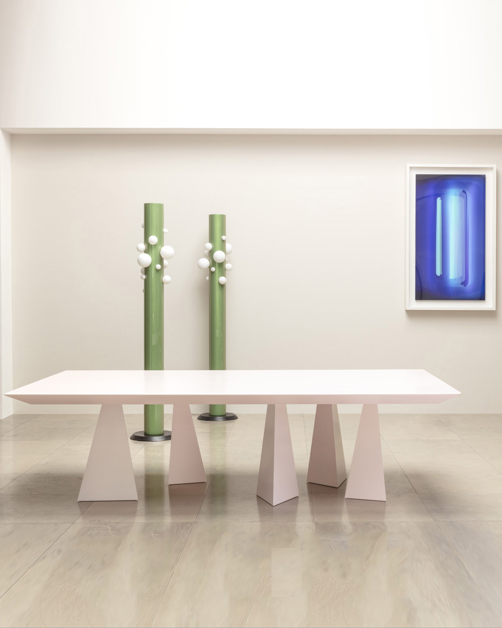 Le piétement mouvementé et anguleux à la disposition aléatoire de la table Agitation lui confère tout son dynamisme. Ici présentée en bois laqué aux nuances de rose poudré, elle peut être exécutée avec des pieds en inox poli miroir et un plateau de pierre ou de bois.